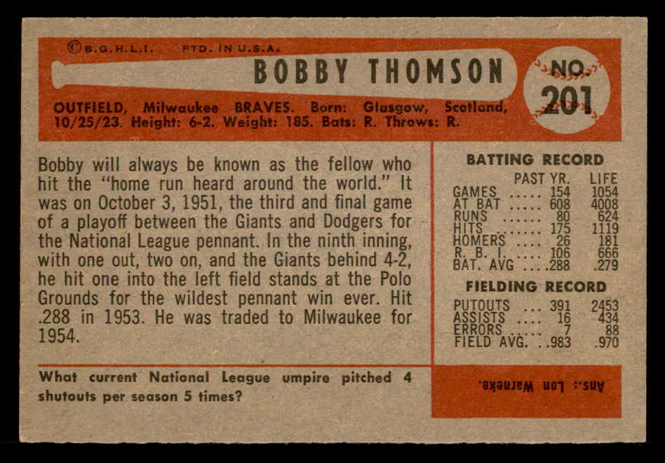 1954 Bowman Baseball #201 Bobby Thomson Braves EX-MT 542018