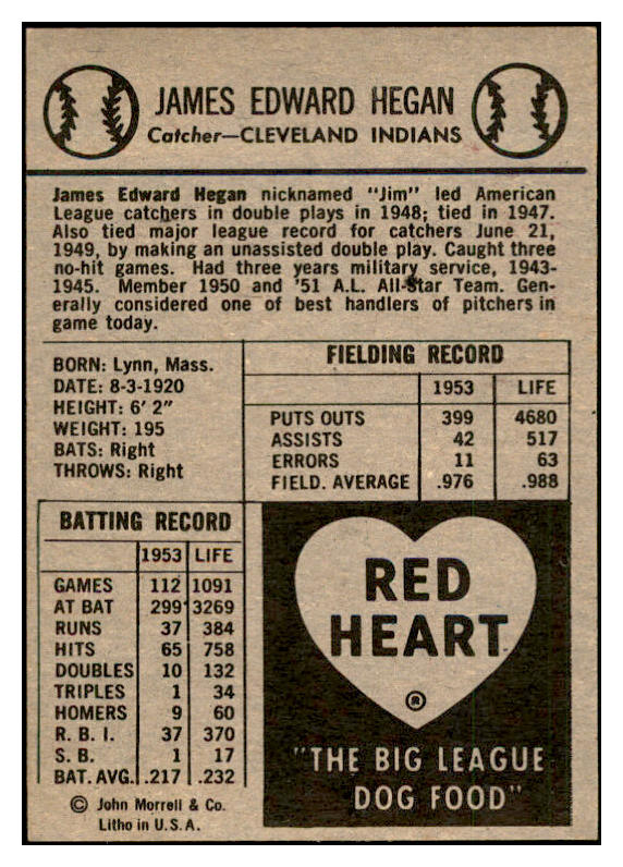 1954 Red Heart Jim Hegan Indians NR-MT 536771