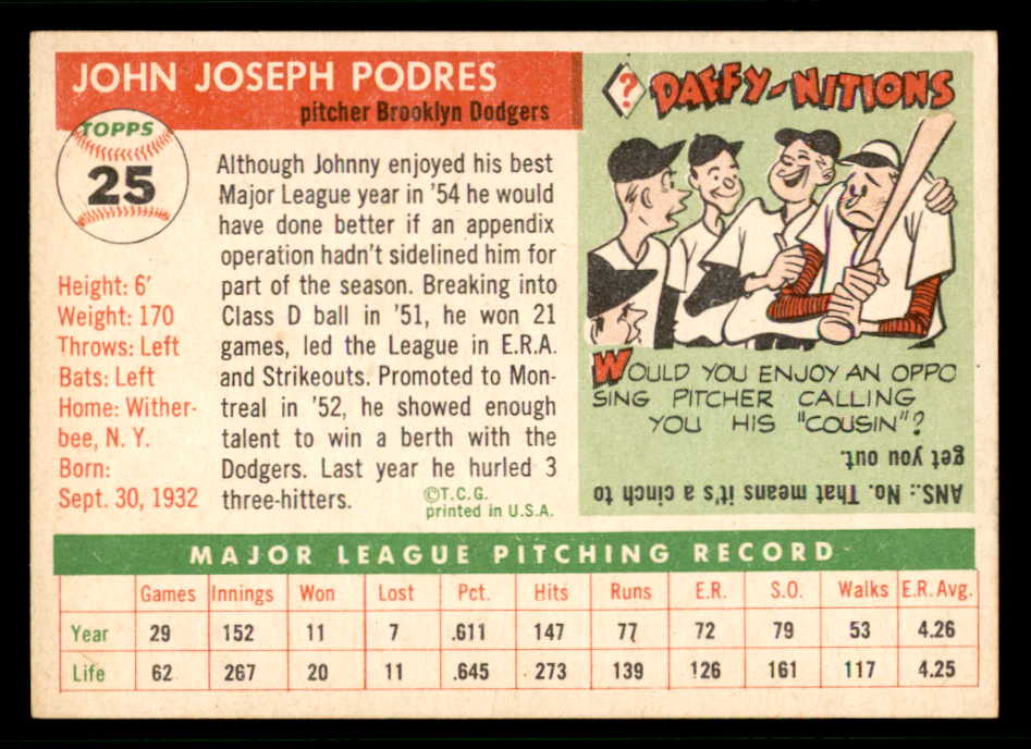 1955 Topps Baseball #025 Johnny Podres Dodgers EX-MT 541985