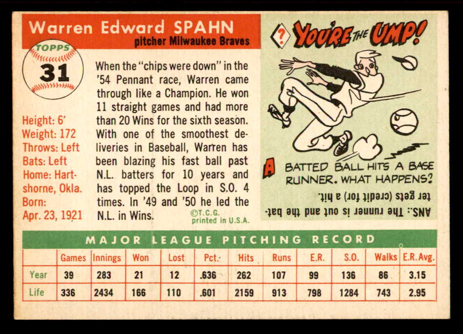 1955 Topps Baseball #031 Warren Spahn Braves EX 539042