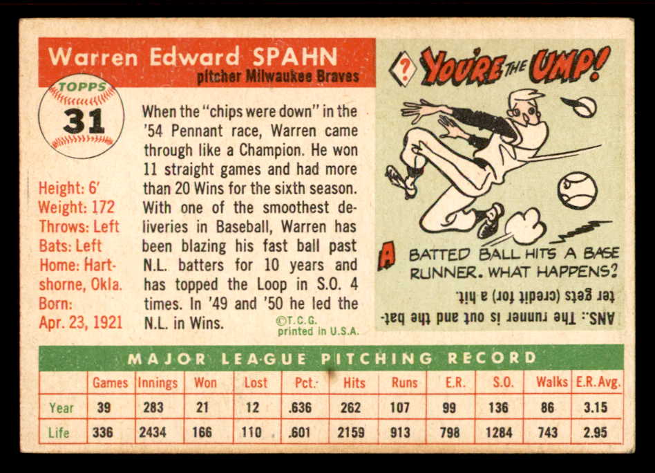 1955 Topps Baseball #031 Warren Spahn Braves EX-MT 539043