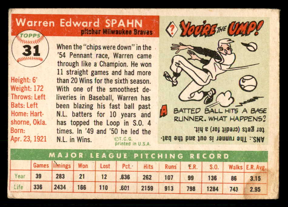 1955 Topps Baseball #031 Warren Spahn Braves VG 541162