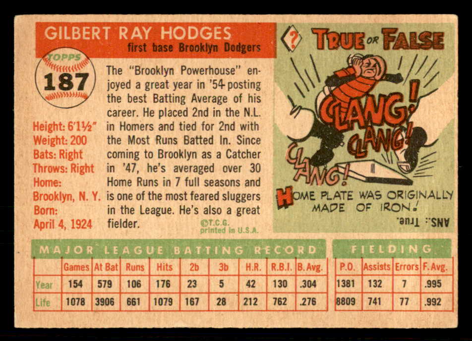 1955 Topps Baseball #187 Gil Hodges Dodgers VG 541164