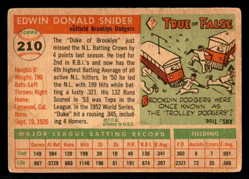 1955 Topps Baseball #210 Duke Snider Dodgers VG 541160