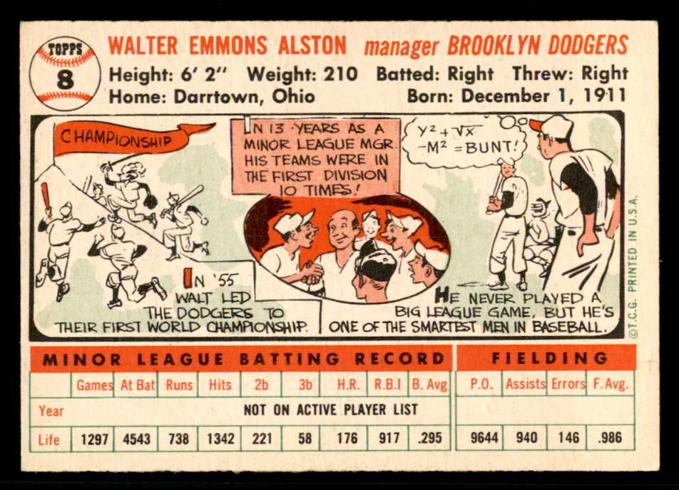 1956 Topps Baseball #008 Walter Alston Dodgers NR-MT White 541180