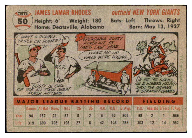 1956 Topps Baseball #050 Dusty Rhodes Giants EX-MT Gray 534955