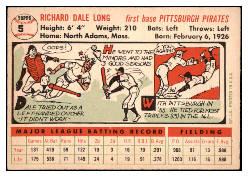 1956 Topps Baseball #056 Dale Long Pirates EX-MT White 528256