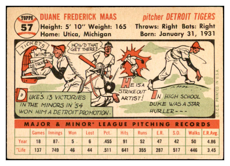 1956 Topps Baseball #057 Duke Maas Tigers EX-MT White 535100