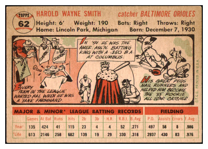 1956 Topps Baseball #062 Hal Smith Orioles EX-MT White 528193