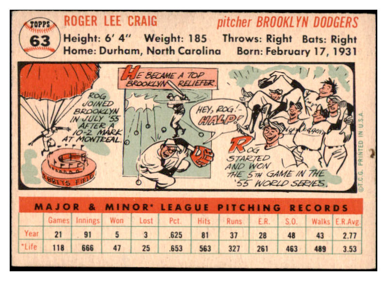 1956 Topps Baseball #063 Roger Craig Dodgers EX-MT White 529693