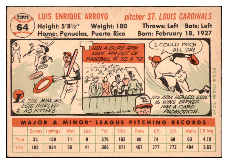 1956 Topps Baseball #064 Luis Arroyo Cardinals EX-MT White 528252