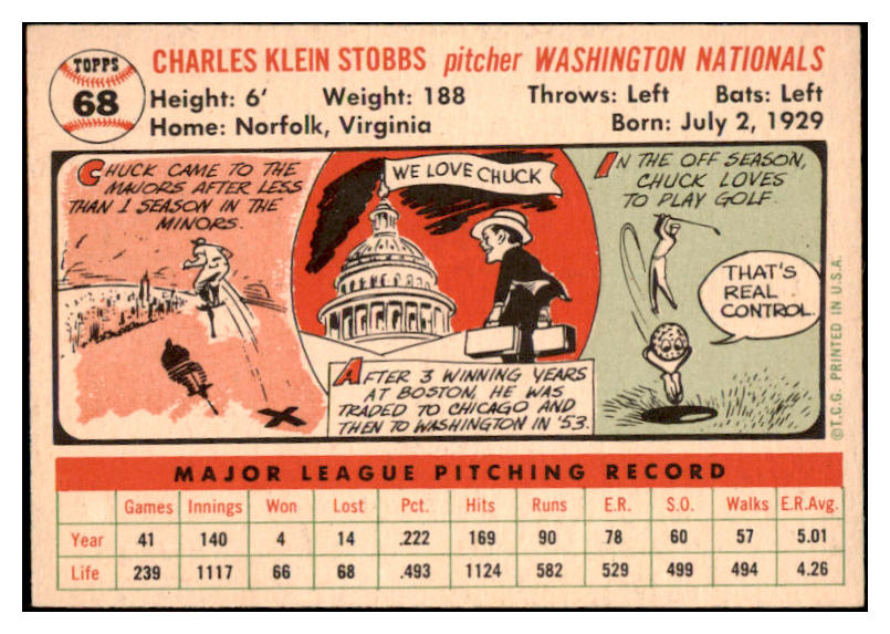 1956 Topps Baseball #068 Chuck Stobbs Senators EX-MT White 528251