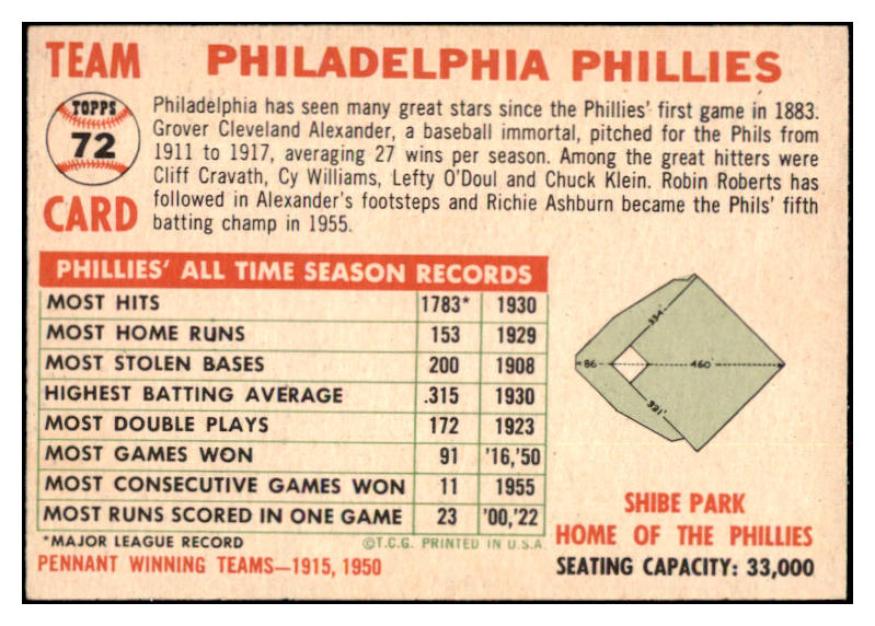1956 Topps Baseball #072 Philadelphia Phillies Team EX-MT Dated 529713