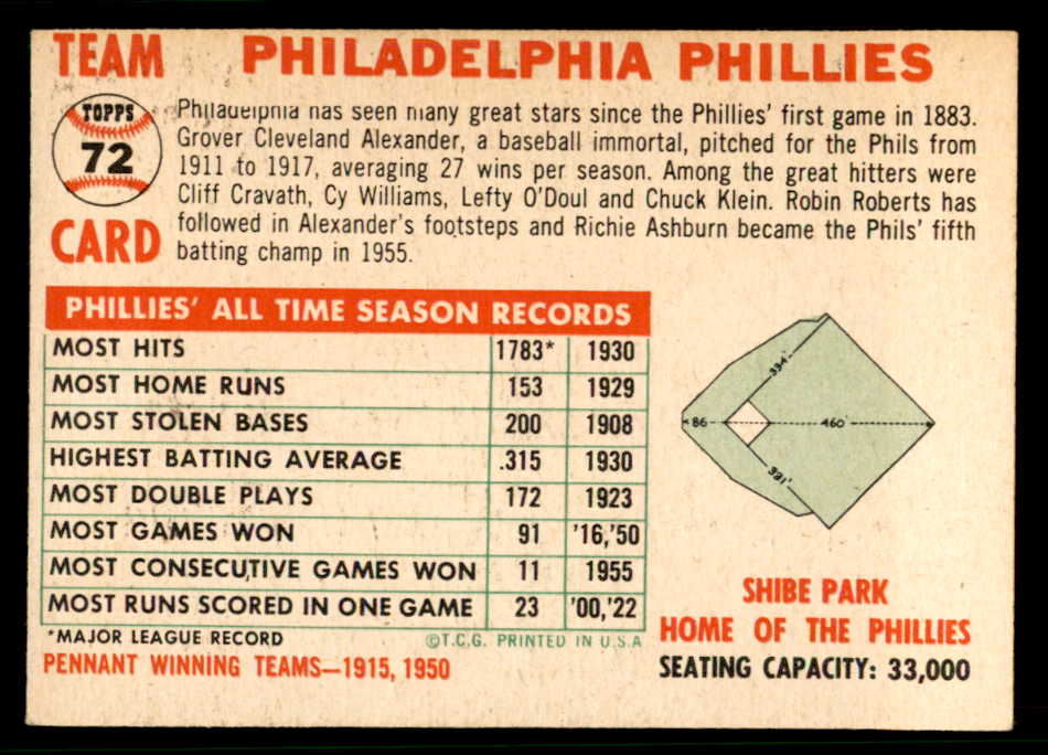 1956 Topps Baseball #072 Philadelphia Phillies Team EX-MT White 542400