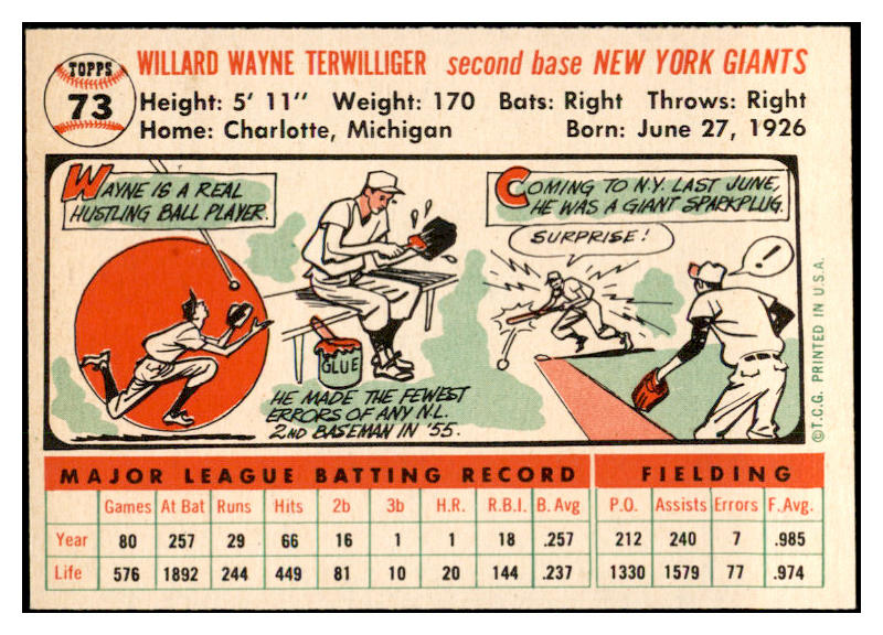 1956 Topps Baseball #073 Wayne Terwilliger Giants EX-MT White 535109