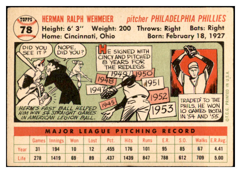 1956 Topps Baseball #078 Herman Wehmeier Phillies EX-MT White 535113