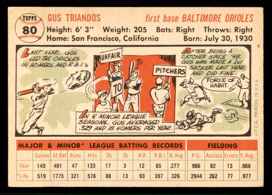 1956 Topps Baseball #080 Gus Triandos Orioles EX-MT White 543253