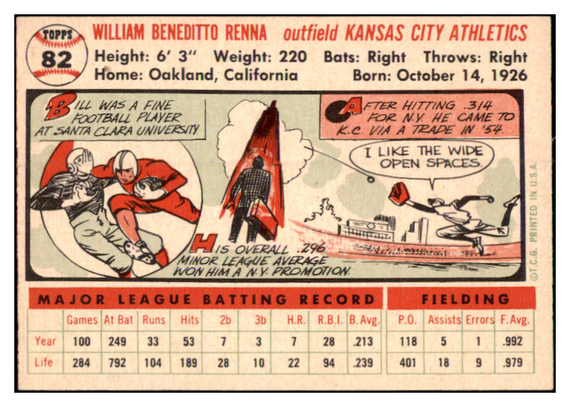 1956 Topps Baseball #082 Bill Renna A's EX-MT White 528373