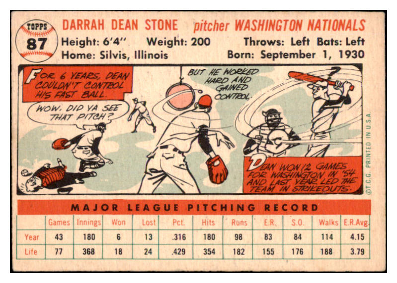 1956 Topps Baseball #087 Dean Stone Senators EX-MT White 528376