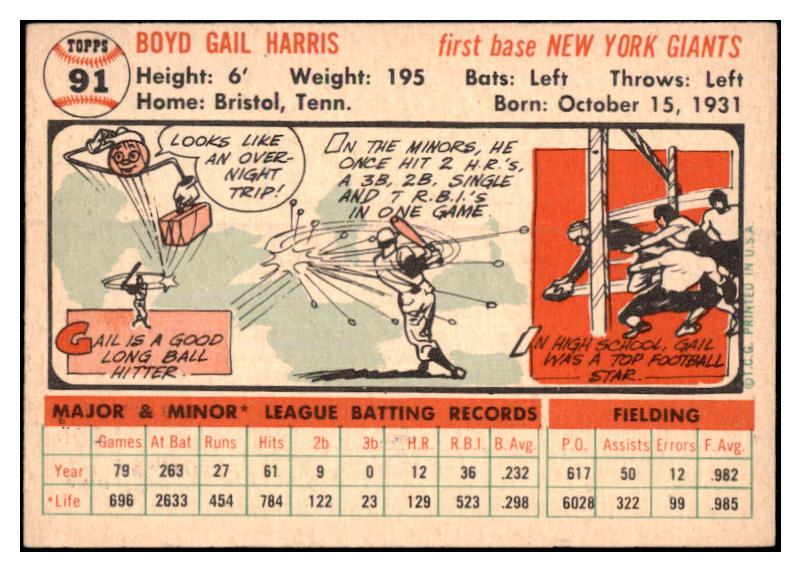 1956 Topps Baseball #091 Gail Harris Giants EX-MT White 528377