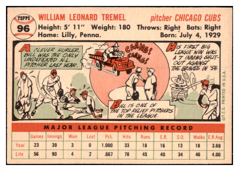 1956 Topps Baseball #096 Bill Tremel Cubs EX-MT White 528379