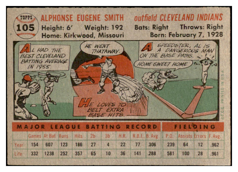 1956 Topps Baseball #105 Al Smith Indians EX-MT Gray 535134