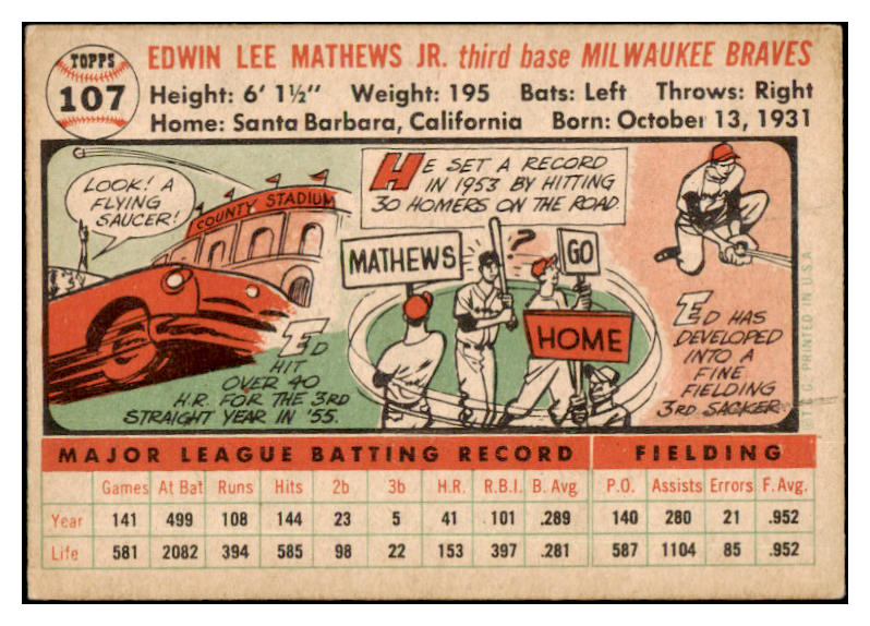 1956 Topps Baseball #107 Eddie Mathews Braves EX White 529318