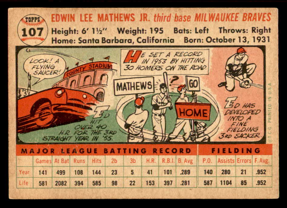 1956 Topps Baseball #107 Eddie Mathews Braves EX White 539091