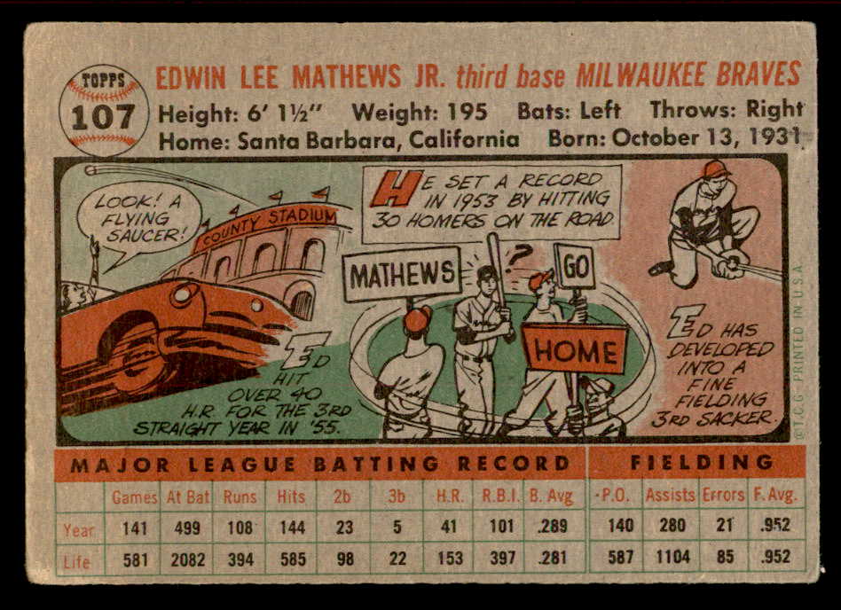 1956 Topps Baseball #107 Eddie Mathews Braves VG-EX Gray 539090
