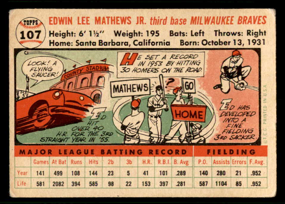 1956 Topps Baseball #107 Eddie Mathews Braves VG White 541231