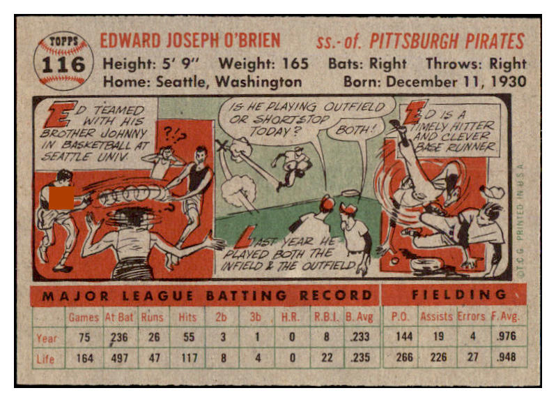 1956 Topps Baseball #116 Eddie O'Brien Pirates EX-MT Gray 528402