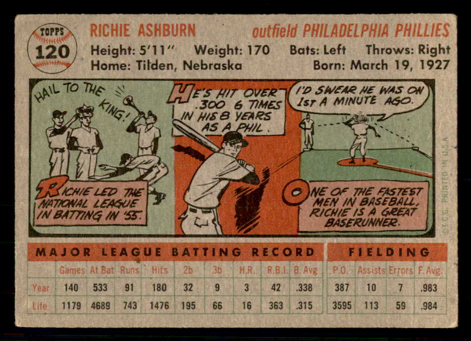 1956 Topps Baseball #120 Richie Ashburn Phillies EX Gray 541191
