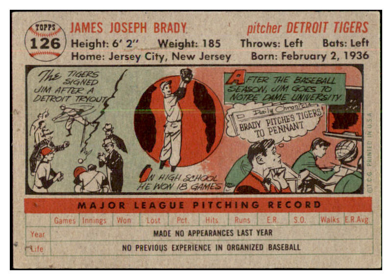 1956 Topps Baseball #126 Jim Brady Tigers EX-MT Gray 528396