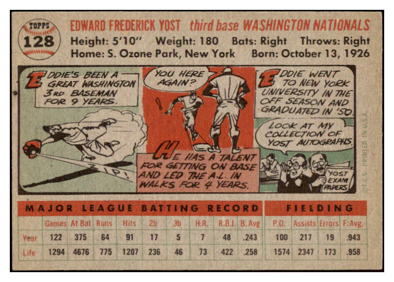 1956 Topps Baseball #128 Eddie Yost Senators EX-MT Gray 528204