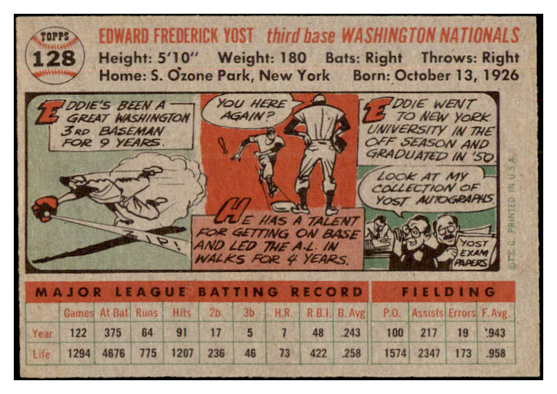 1956 Topps Baseball #128 Eddie Yost Senators EX-MT Gray 528387