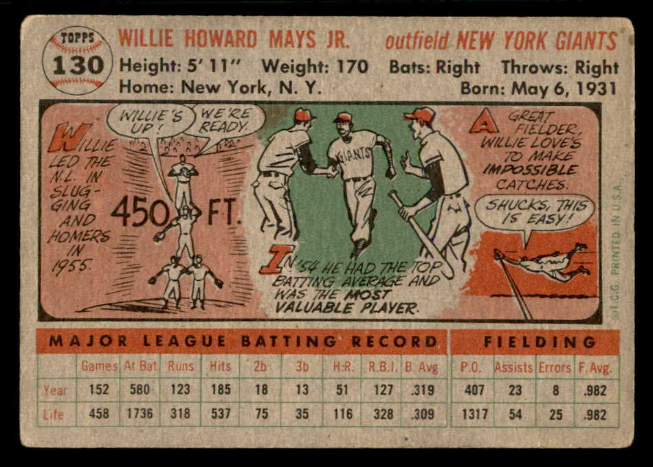 1956 Topps Baseball #130 Willie Mays Giants Good Gray 538469