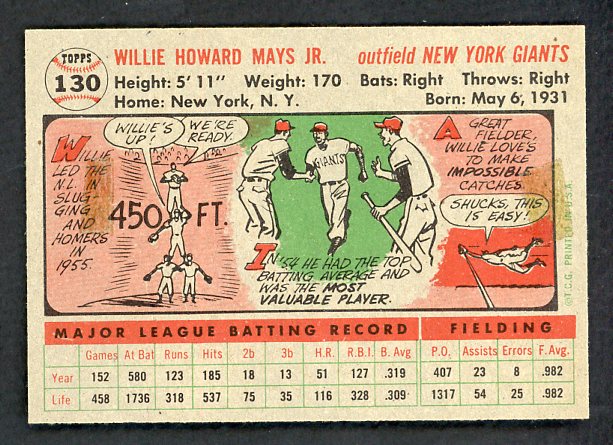 1956 Topps Baseball #130 Willie Mays Giants Good tape residue back Gray 538603