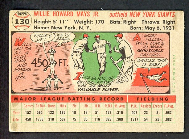 1956 Topps Baseball #130 Willie Mays Giants VG-EX Gray 538600