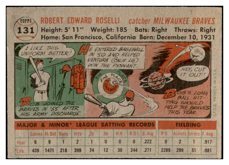 1956 Topps Baseball #131 Bob Roselli Braves EX-MT Gray 535156