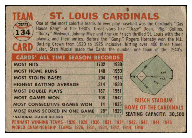 1956 Topps Baseball #134 St. Louis Cardinals Team VG Gray 532544