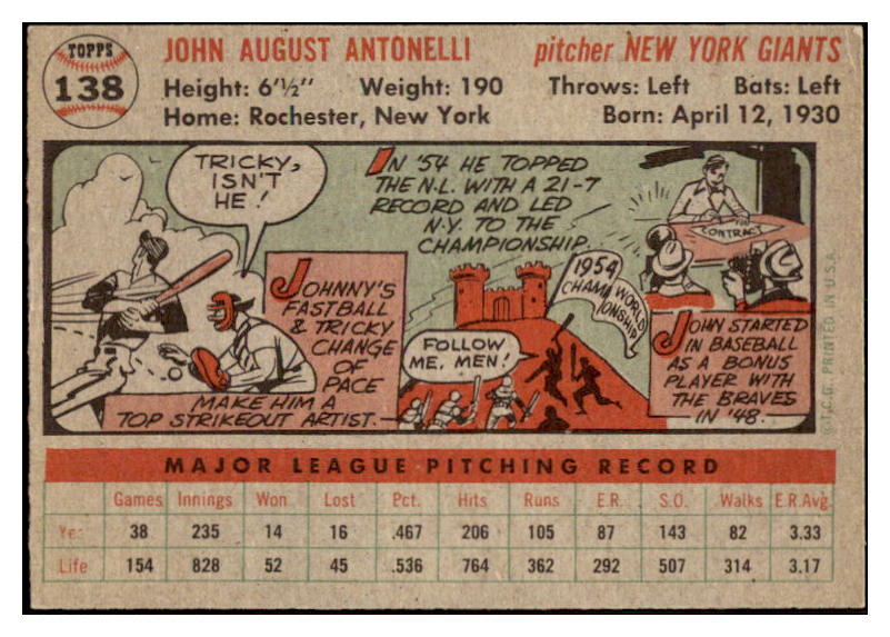 1956 Topps Baseball #138 Johnny Antonelli Giants EX-MT Gray 528207