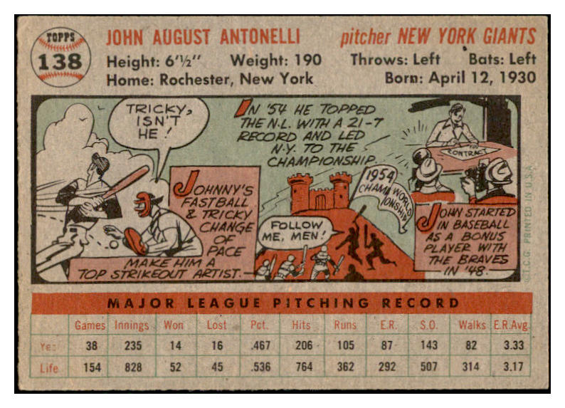 1956 Topps Baseball #138 Johnny Antonelli Giants EX-MT Gray 535163