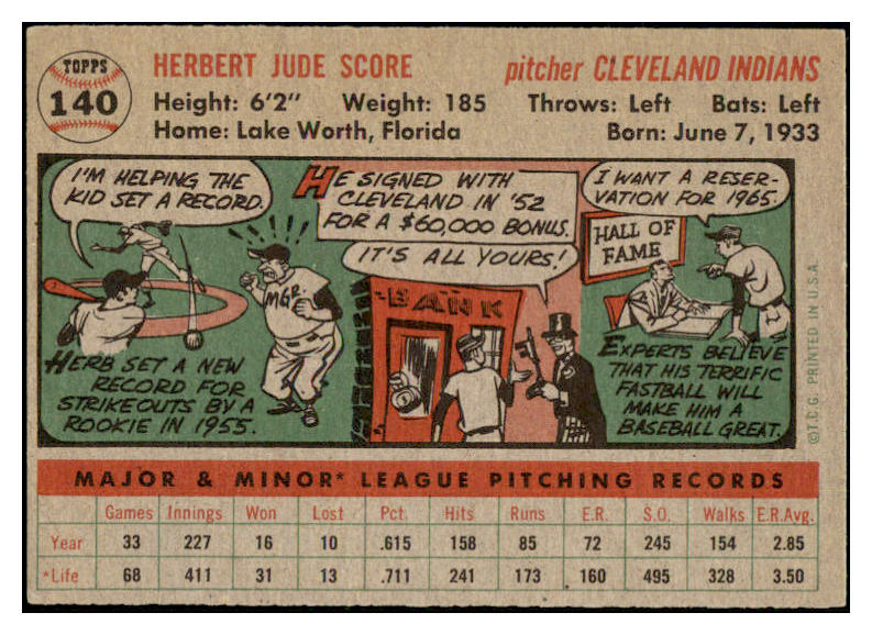 1956 Topps Baseball #140 Herb Score Indians EX+/EX-MT Gray 528769
