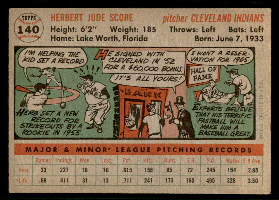 1956 Topps Baseball #140 Herb Score Indians VG Gray 541212