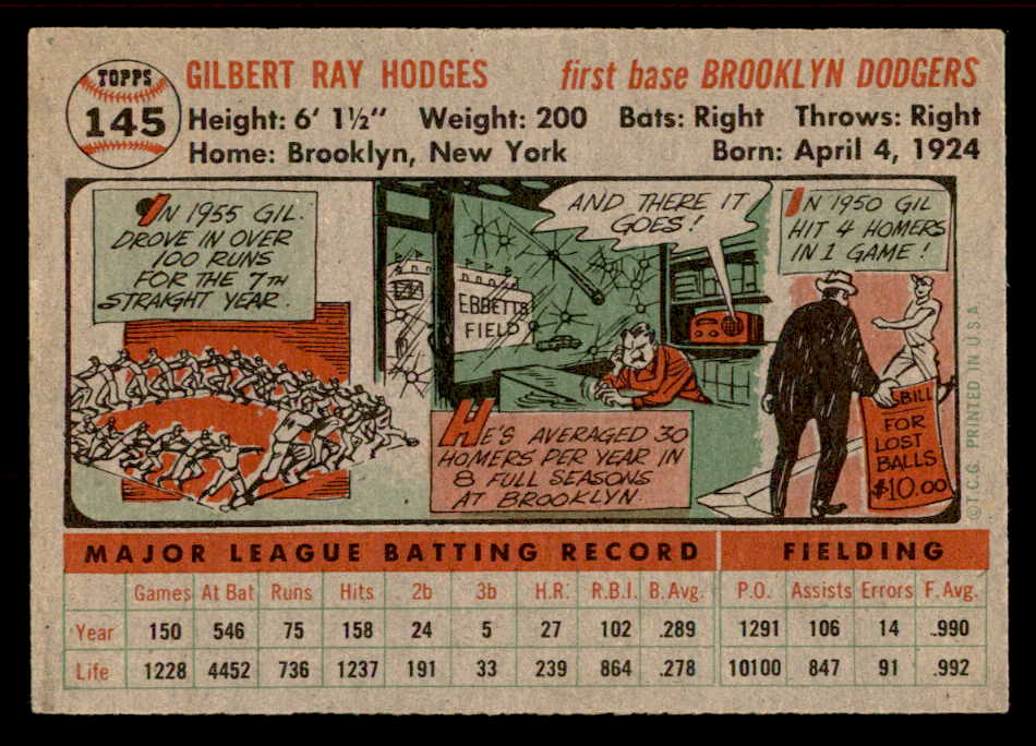 1956 Topps Baseball #145 Gil Hodges Dodgers EX-MT Gray 539083
