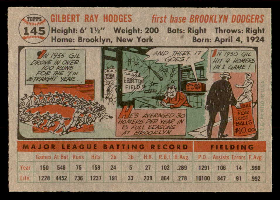 1956 Topps Baseball #145 Gil Hodges Dodgers EX-MT Gray 539136