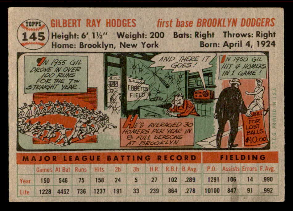 1956 Topps Baseball #145 Gil Hodges Dodgers VG-EX Gray 539084