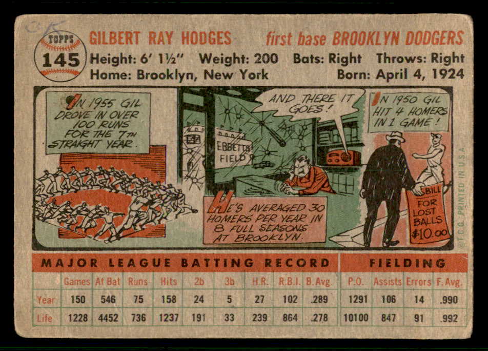 1956 Topps Baseball #145 Gil Hodges Dodgers VG Gray 541184