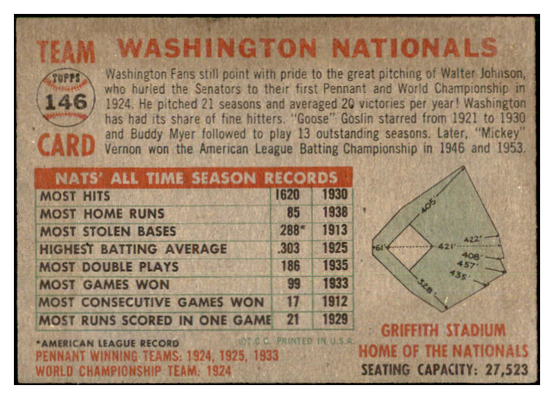 1956 Topps Baseball #146 Washington Senators Team VG-EX Gray 534299