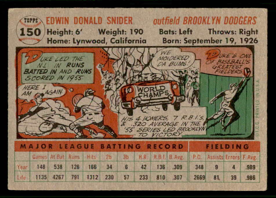 1956 Topps Baseball #150 Duke Snider Dodgers EX+/EX-MT Gray 541865